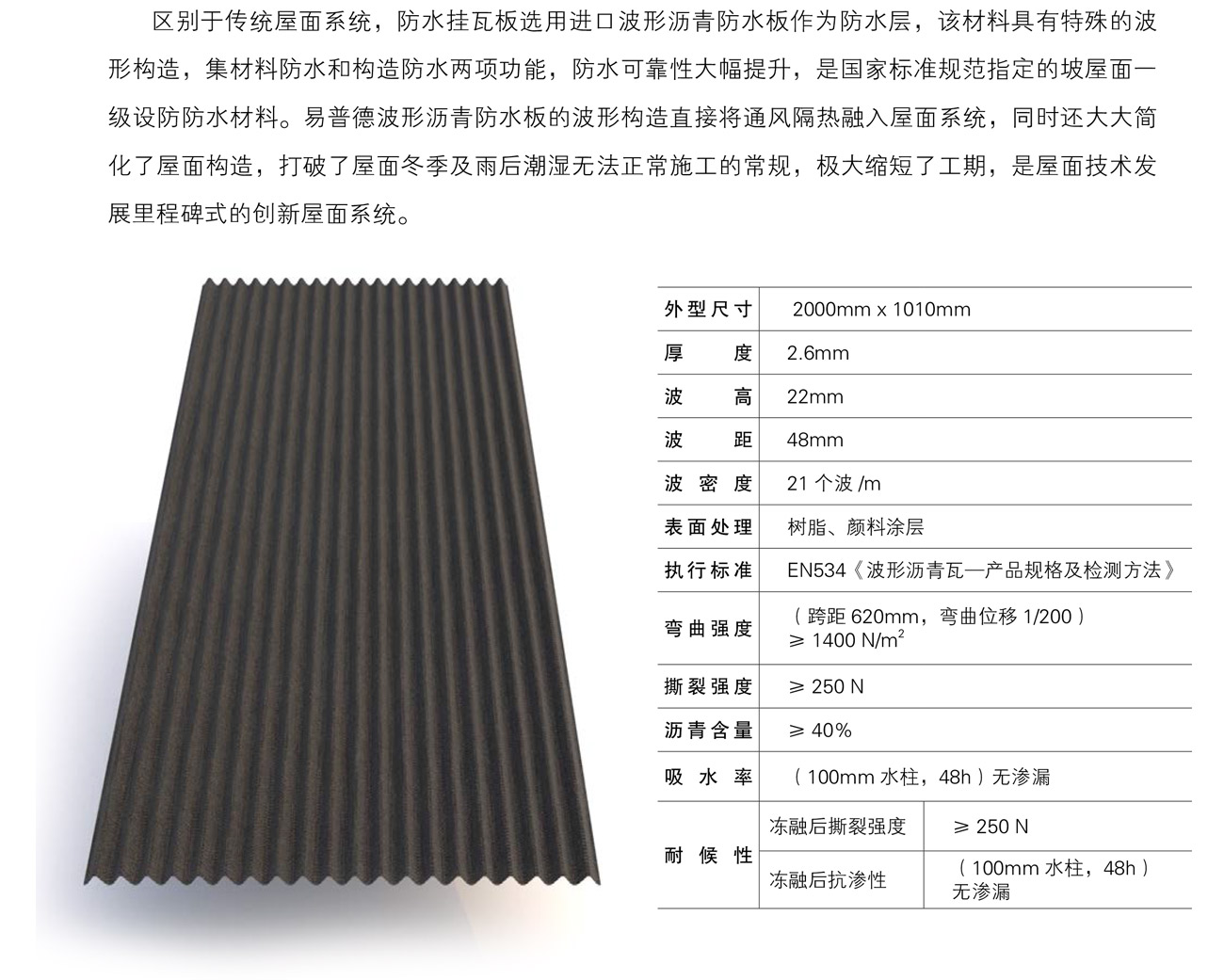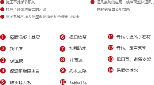 借鑒歐洲坡屋面防水理念,將平面防水改為立體防水,采用新型防水板材料,將材料防水和構造防水于一身,配合屋面系統(tǒng)組件,實現(xiàn)全天候全干作業(yè)。節(jié)省了屋面各類保護層次,打破了屋面冬季及雨后陰濕無法施工的常規(guī),縮短了工期,提升系統(tǒng)安全性能。